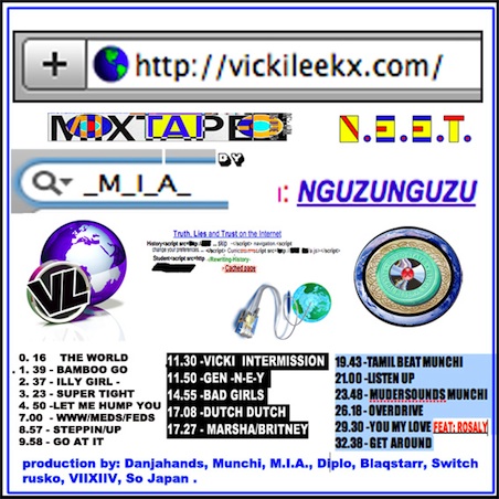 Released online earlier today and featuring previously unheard tracks as well as leaked versions of tracks that appeared on \/\/\Y/\ (as well as the usual cliched diatribes and tiresomely provocative zietgeist-grabbing hype), M.I.A.’s new, and rather good mixtape with Nguzunguzu – a wince-inducing play on Wikileaks called Vicki Leekx – can be downloaded here.